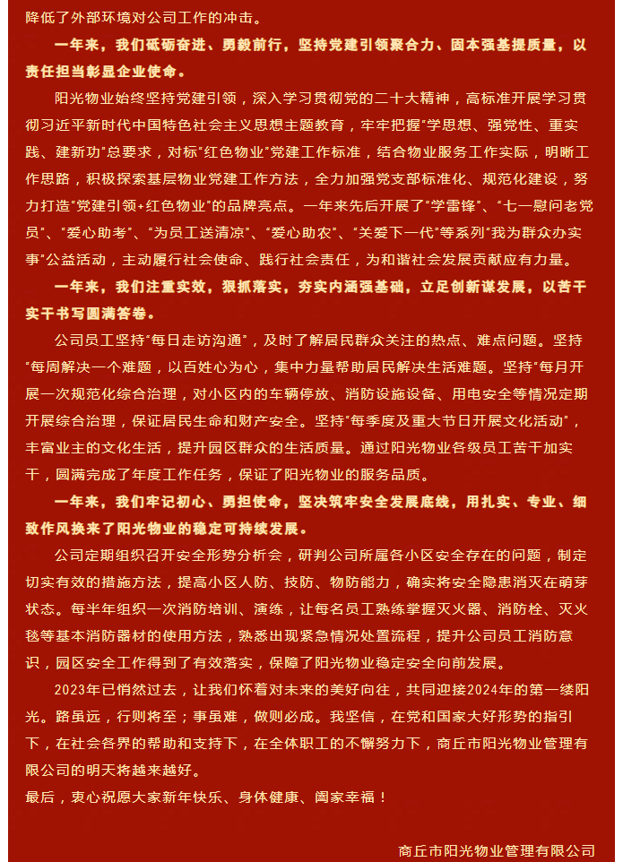 陽光物業(yè)成立于2003年5月,專注物業(yè)服務(wù)行業(yè)20余載,陽光物業(yè)現(xiàn)為河南省物業(yè)管理協(xié)會(huì)副會(huì)長單位、商丘市物業(yè)管理協(xié)會(huì)副會(huì)長單位,公司注冊(cè)資金1020萬元,陽光物業(yè)連續(xù)多年被河南省及商丘市評(píng)為先進(jìn)企業(yè)、優(yōu)秀企業(yè)。