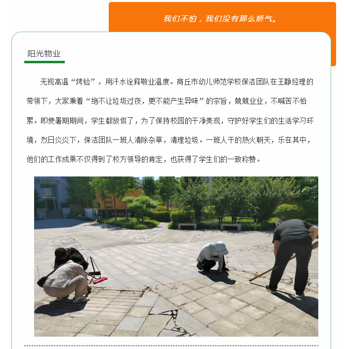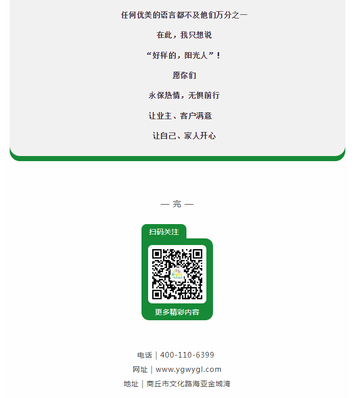 陽光物業(yè)成立于2003年5月,專注物業(yè)服務行業(yè)20余載,陽光物業(yè)現(xiàn)為河南省物業(yè)管理協(xié)會副會長單位、商丘市物業(yè)管理協(xié)會副會長單位,公司注冊資金1020萬元,陽光物業(yè)連續(xù)多年被河南省及商丘市評為先進企業(yè)、優(yōu)秀企業(yè)。
