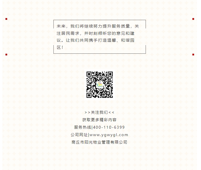 陽(yáng)光物業(yè)成立于2003年5月,專注物業(yè)服務(wù)行業(yè)20余載,陽(yáng)光物業(yè)現(xiàn)為河南省物業(yè)管理協(xié)會(huì)副會(huì)長(zhǎng)單位、商丘市物業(yè)管理協(xié)會(huì)副會(huì)長(zhǎng)單位,公司注冊(cè)資金1020萬(wàn)元,陽(yáng)光物業(yè)連續(xù)多年被河南省及商丘市評(píng)為先進(jìn)企業(yè)、優(yōu)秀企業(yè)。